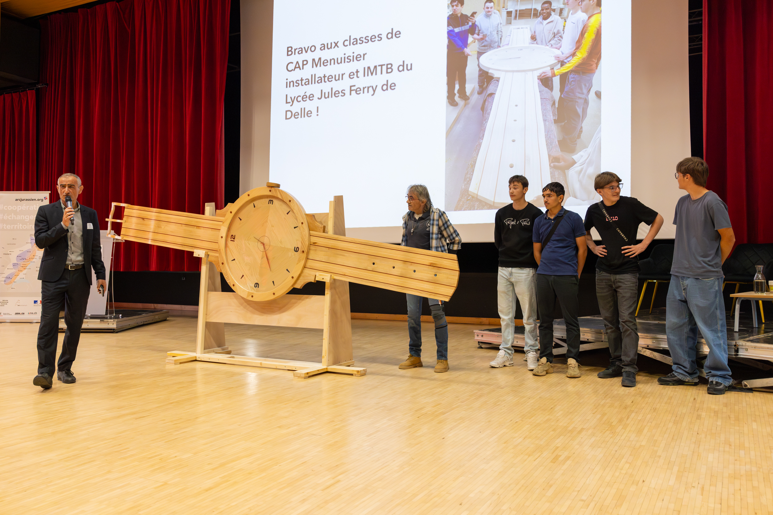 Plus de trois mètres de long : la montre XXL confectionnée par les élèves de CAP Menuisier installateur du lycée Jules Ferry de Delle est une véritable prouesse technique : « Nous voulions créer un objet en bois, représentant le savoir-faire commun entre nos deux pays : l’horlogerie. On a choisi de créer cette montre géante. Cela favorise le sentiment d’appartenance à un espace commun d’une population pourtant différente » expliquent les élèves, intimidés et surpris de recevoir leur prix. L’objet - qui fonctionne et qui donne l’heure ! – a nécessité deux mois de travail (soit une soixantaine d’heures) et a mobilisé 25 élèves.