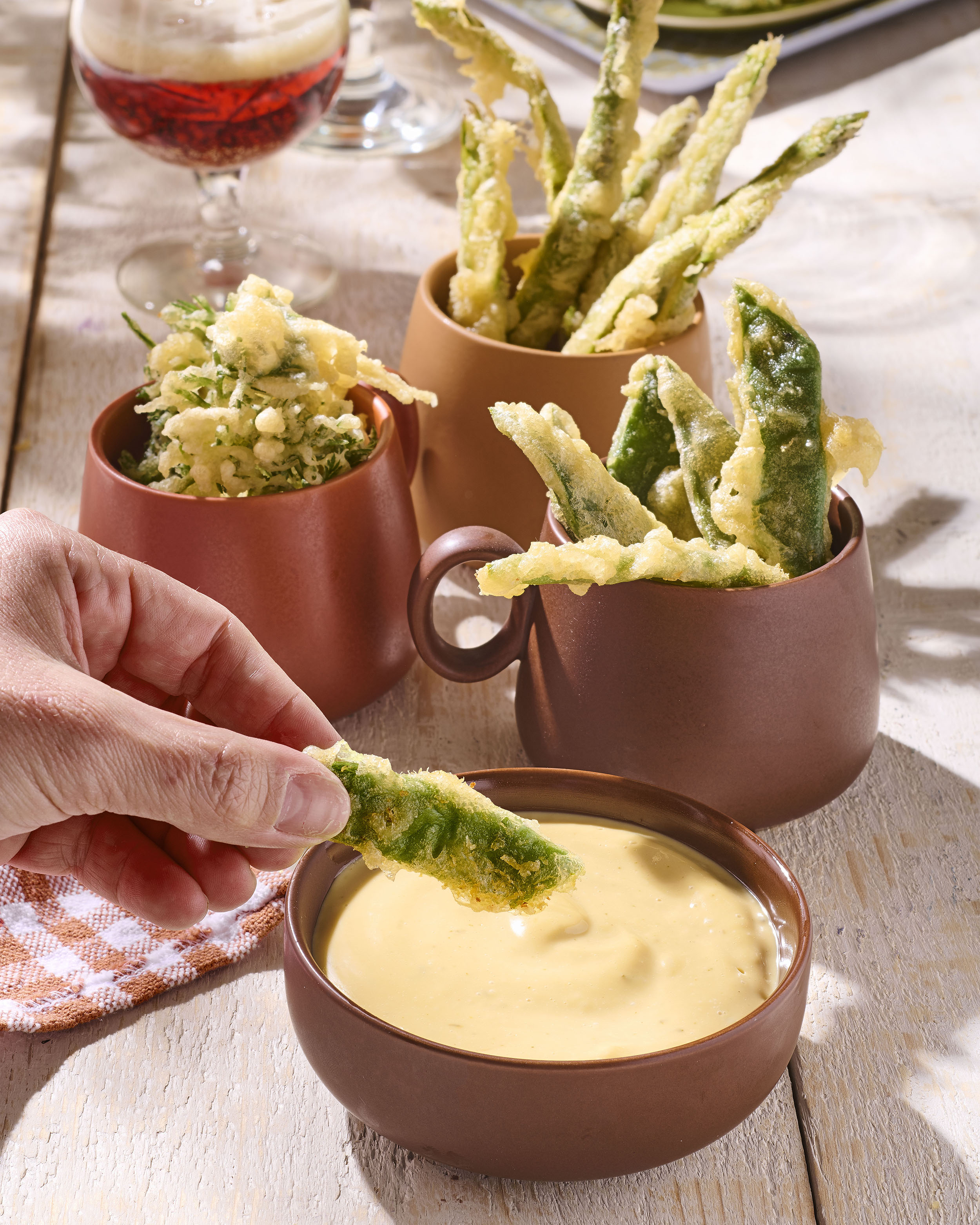 - Pour 6 personnes : 8 asperges vertes, 16 haricots plats, quelques fanes de carotte, 1 jaune d’œuf, 30 cl de pâte à tempura, 50 cl de bière brune, huile de pépin de raisin, 1 c. à café de moutarde, sel.